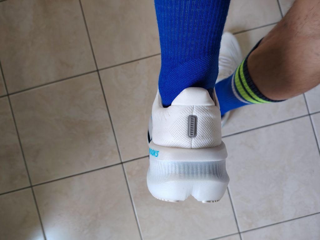 Dès l’ouverture de la boîte, c'est un véritable effet « Waouh ! ». Elle est vraiment top au niveau design, grosse semelle striée avec un dégradé bleu sur toute la longueur. Le logo Brooks est bien apparent sur le tissu. Une vraie réussite ! Le design est innovant par sa semelle imposante et qui propose une nouvelle mousse avec des cellules plus grandes sous le talon qui garantissent un atterrissage en douceur et des plus petites à l’avant pour dynamiser la foulée de la chaussure. On est sur une supertrainer qui se fait de plus en plus dans toutes les marques de running, ce qui en fait une chaussure best-seller.