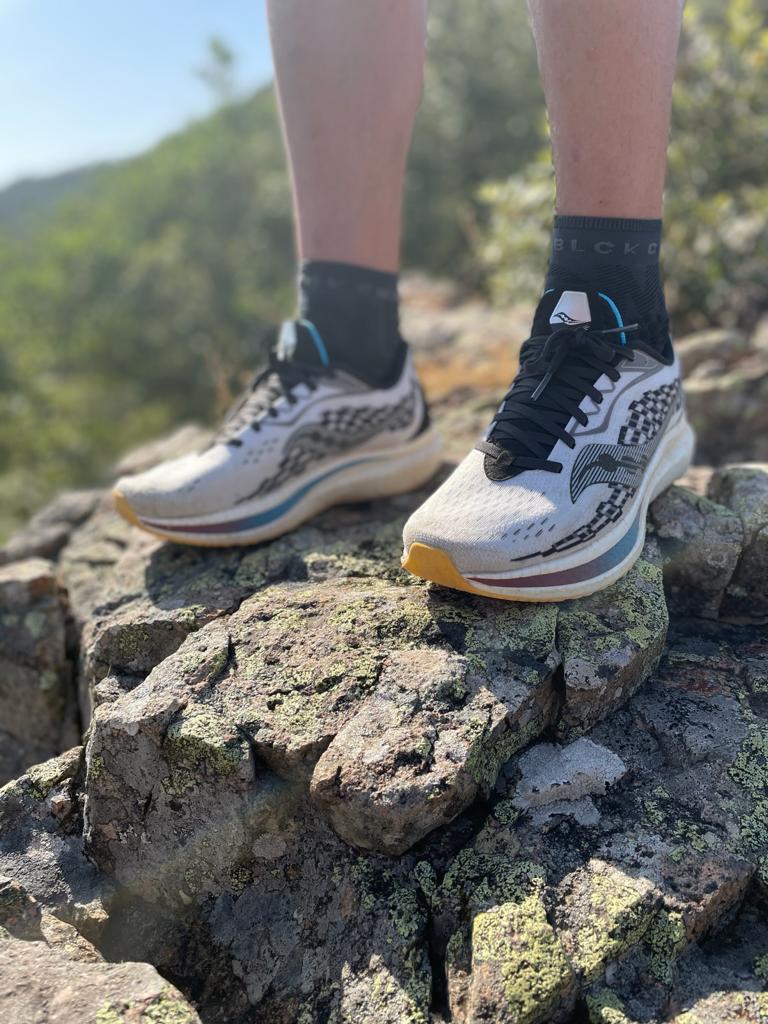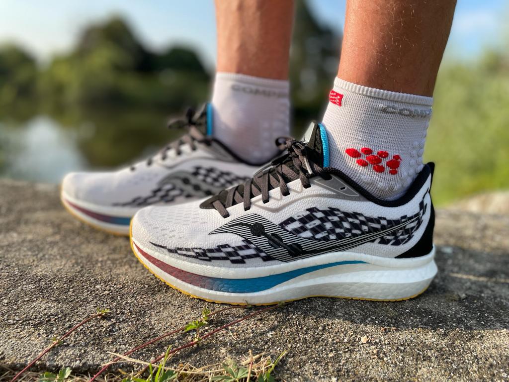Le look est singulier avec le damier qui rappelle l’arrivée des courses. Au niveau design et couleurs, Saucony tient quelque chose, car elles sortent de l’ordinaire et attirent l’œil. La couleur blanche peut être perçue comme salissante, mais le mesh se nettoie relativement bien. Elles apparaissent également un peu massives de prime abord, mais restent légères.