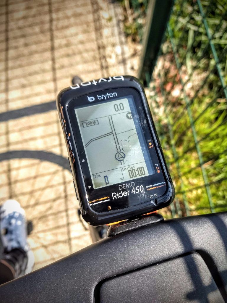 Comment tout cela se traduit sur la route ? Plutôt pas mal ! L’acquisition GPS se fait très rapidement au départ des sorties et les pertes de signal quasi-inexistantes, même dans les zones les plus arborées, certainement aidée par la prise en charge de tous les systèmes de satellites du monde : GPS, Glonass (Russie), BDS (Chine), Galileo (Europe) et QZSS (Japon) Pour ce test j’ai opté pour l’utilisation 100% GPS mais la connexion avec le capteur de cadence et de vitesse Bontrager Duotrap dans mon cas se fait parfaitement elle aussi. Après deux sorties le compteur a montré une petite faiblesse, il a relancé à 2 reprises un entrainement, pas très grave en soi, même si un peu ennuyeux quand on est à cheval sur les données (à noter tout de même la perte de l’enregistrement de l’un des circuits dans l’affaire…). Comme je roule depuis peu en Di2, je me suis amusé à connecter ma transmission au Bryton Rider 450 afin de connaitre les informations sur mon braquet ou mon niveau de batterie, c’est du gadget me direz-vous mais finalement assez utile dans certaines situations. Enfin, pour finir avec l’aspect entrainement et études de données, le compteur se synchronisera automatiquement avec votre application Strava pour la plus connue (attention pas de « Strava live »), mais aussi avec Training Peaks ou bien Selfloops. Sachez que le compteur est livré avec une fixation basique élastique pour cintre ou potence, mais Bryton propose en option plusieurs fixations « Front mount ». Si vous êtes dans mon cas et disposez d’un cintre combiné aéro, la fixation sous le compteur est identique à celle d’un Garmin, donc le compteur vélo trouvera facilement sa place avec votre support spécifique. Côté navigation, ici pas de couleurs ! Bryton a fait le choix du monochrome, encore une fois pour maîtriser les coûts mais aussi et certainement pour conserver une autonomie maximum, la marque annonce près de 32 heures d’autonomie en fonctionnement, ce qui permettra de faire un petit paquet de kilomètres sans avoir à se soucier du niveau de batterie. Le fond de carte et toutes les informations sont parfaitement lisibles sur l’écran de 2.3 pouces et les indications de parcours sont assez claires.