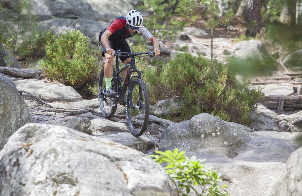 Il est toujours révélateur de prendre en main un vélo aussi facilement. Vous savez, ce genre d’impression qui vous fait penser que vous avez déjà roulé avec ce VTT cross country et que vous êtes tout de suite à l’aise dessus. C’est bien le cas de ce BMC qui ne fâche personne en matière de position et de géométrie. Rien d’extrême, tout est équilibré, les points d’appuis sont évidents et confortables. On se sent bien. Tout est équilibré et tout a été pensé pour la polyvalence et le confort. Rien de plus logique ceci dit, vu le positionnement que BMC a voulu donner à son nouvel engin. Mais comprenez bien que cela ne veut pas dire que le vélo est fade. Alors certes, ce n’est pas le plus funky qu’on ait eu à rouler récemment. Mais sa géométrie et la position qu’il offre sur le poste de pilotage permet de soigner celui-ci quand c’est nécessaire et de se faire vraiment plaisir. Et ça tombe bien : avec ses 120 mm couplés à ses grandes roues de 29 pouces, le BMC n’est clairement pas un crosseur. Pas du tout ! Il affiche un comportement de vélo passe-partout, parfait pour les singles techniques, cassants et les virées en montagne. On a parfois coutume de dire qu’on ressent plus de débattement qu’annoncé sur certains vélos. C’est tout à fait vrai sur celui-ci et il faut porter cela au crédit d’une suspension très efficace, elle-même polyvalente.
