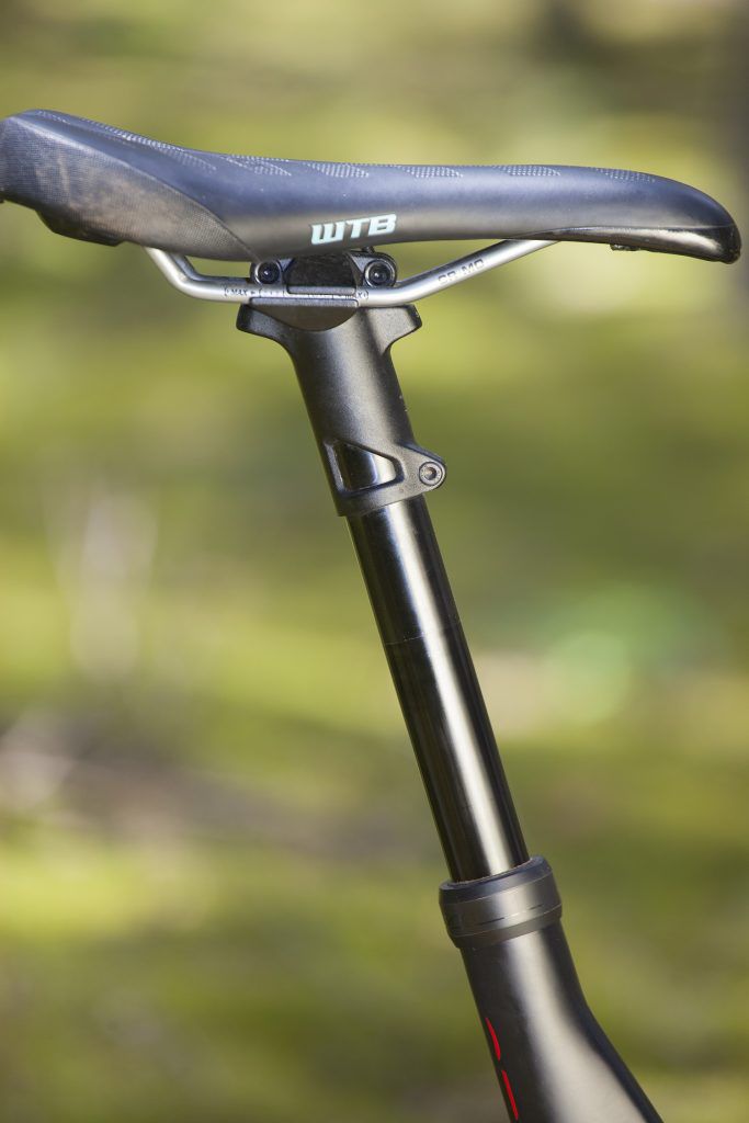 Il faut forcément être averti pour savoir que ce BMC dissimule un étonnant concept dans ses entrailles. Car visuellement, rien ne laisse le supposer. Ah si ! Approchez un peu vos yeux de cette tige de selle, pour constater qu’on n’aperçoit qu’un plongeur et pas de corps. Tiens, bizarre. Cette tige de selle maison coulisse directement dans le tube de selle et annonce la présence d’un concept novateur. Le Trailsync - c’est son nom - permet de relier directement et instantanément l’action de cette dernière avec le comportement de l’amortisseur et par extension du vélo. Ce qui permet d’optimiser le Speedfox dans la situation d’un pédalage selle haute et d’un pilotage selle basse. Une évidence théorique, certes, maintenant que nous l’avons sous les yeux, sauf que c’est bien une grande première dans l’industrie du VTT pourtant si fertile en petites trouvailles. Comme quoi, il reste toujours des choses à faire, c’est rassurant.