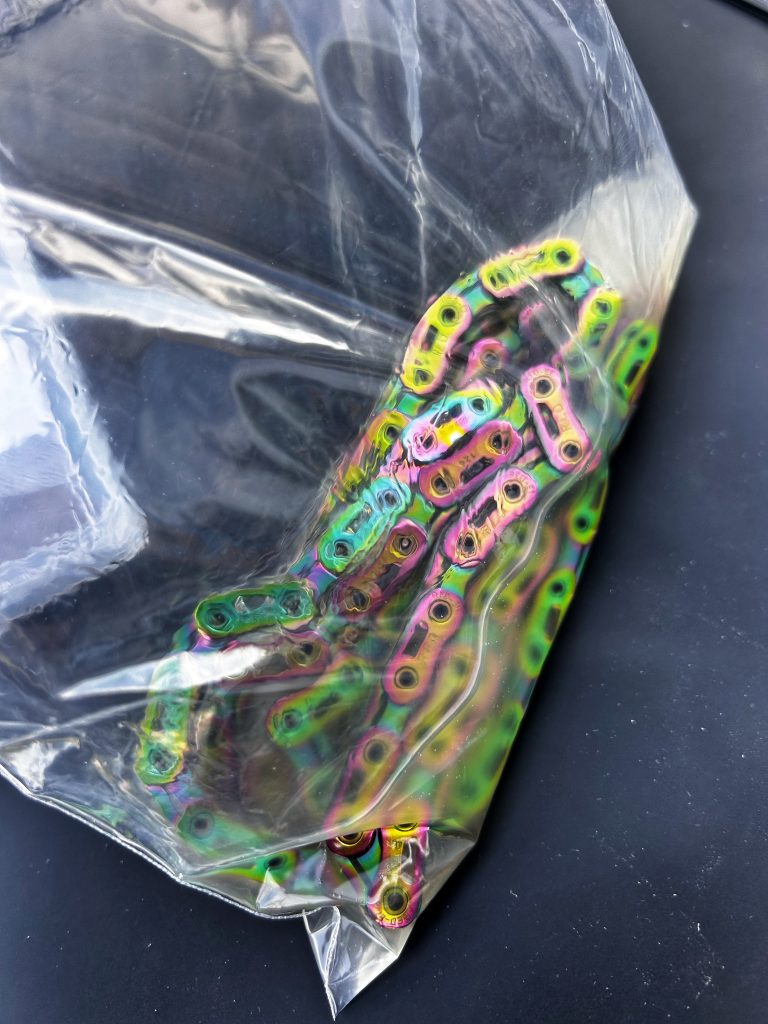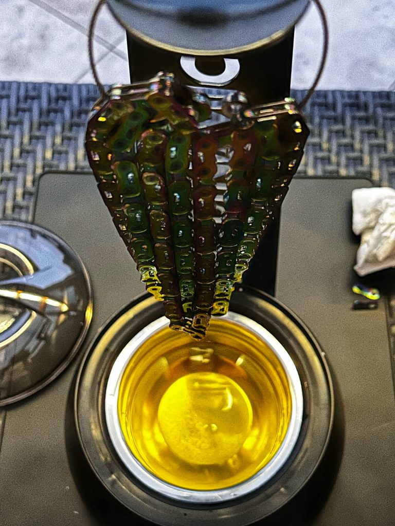 Fin de cuisson ! On sort délicatement la chaîne en prenant soin de ne pas se brûler, puis on l’égoutte pendant quelques minutes. On peut voir que la cire, au contact de l’air, se fige et forme une légère pellicule blanchâtre sur la chaîne. Durant son immersion, la cire a pu pénétrer en profondeur dans tous les maillons et les petits rouleaux qui la composent, et c’est bien là que se trouve la force de ce système.