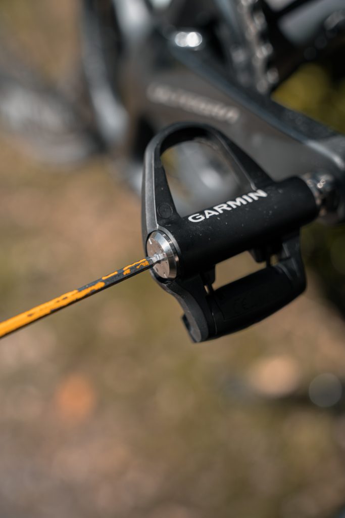 Vous remarquerez tout de suite que l’empreinte BTR habituelle de vos pédales est ici remplacée par l’émetteur Bluetooth/ANT+. Il vous faudra donc retrouver cette bonne vieille clé à pédales pour les installer correctement sur votre pédalier. Et là encore, rien de particulier. À noter si ce n’est que les émetteurs sont en légère protubérance par rapport à l’axe. De ce fait, il est conseillé de vérifier que dans le cas extrême du rapport petit pignon et grand plateau, ces ‘déports’ ne viennent pas toucher la chaîne. Auquel cas, Garmin fournit également deux entretoises à placer entre l’axe et la manivelle. Dans un set up Shimano Ultegra di2, rien de particulier.