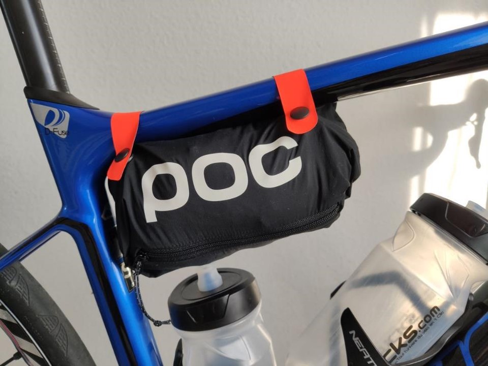 Nous y sommes, la poche arrière dispose d'une double fonction : lorsqu'on la retourne, nous pouvons plier la veste à l'intérieur et en faire un petit sac avec un beau logo POC. Ce petit sac dispose de 2 sangles orange avec 2 fermoirs pression qui permettent de l'accrocher sur le tube supérieur du cadre du vélo.