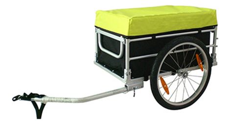 Remorque en alu a vocation utilitaire pour le transport d objets ou materiel peu encombrant et relativement leger montage et demontage rapide sans outils roues 20 avec moyeu fusee dimensions hors bras longueur 68cm largeur 42cm hauteur 38 cm drapeau assurant la visibilite et la securite