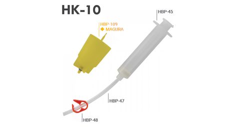 Ce kit permet une purge rapide et facile des freins magura caracteristiques compatible avec la plupart des freins magura ce kit comprend 1 entonnoir de purge de couleur jaune y compris bouchon d huile 1 seringue 4 tuyaux de raccordement en pu d une longueur de 10 cm 1 clip de fixation