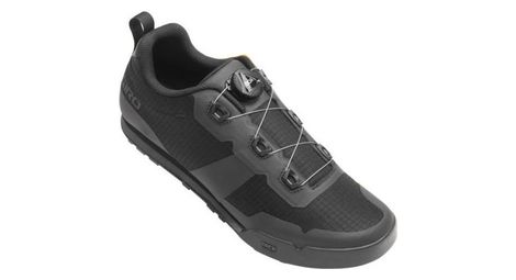 La giro tracker repond au besoin d une chaussure a pedale plate adaptee au cyclisme e bike suffisamment legere confortable et respirante pour les aventures de toute la journee sans pour autant sacrifier l adherence ou les performances lorsque vous en avez besoin cette chaussure elegante se debarrasse de tout encombrement excessif tout en s inscrivant dans la lignee directe de nos chaussures de pedalage plat plus agressives le profil est optimise avec une faible hauteur de pile qui place le pied plus pres de la pedale en outre la semelle exterieure en caoutchouc tack engage les broches de pedale plate avec confiance et une semelle intermediaire en eva a double couche assure le confort pour les randonnees hors velo une seule molette boa l6 montee sur la languette permet une mise en place et un retrait rapides ainsi qu un micro ajustement pour un maintien optimal giro a apporte trois ameliorations cles a notre chaussure de pedalage a plat reduction de la hauteur de l empilement pour un meilleur controle aplatissement du ressort des orteils pour un meilleur contact avec la pedale et augmentation de la largeur de l avant pied permettant a vos orteils de s ecarter pour augmenter le confort et les sensations giro a developpe son propre compose hautement elastique le tack rubber il offre l adherence de la semelle exterieure necessaire pour tenir les pedales sur les terrains les plus accidentes details textile a sechage rapide superpositions en pu thermo colle fermeture boa l6 dial avec lacets en acier inoxydable guides de lacets moules par injection lit de pied moule par injection semelle intermediaire en eva semelle exterieure en caoutchouc tack conception de la bande de roulement gamma optimisee pour les broches de pedale compatibilite pedale plate uniquement sans cale couleur noir poids 337 g taille 43
