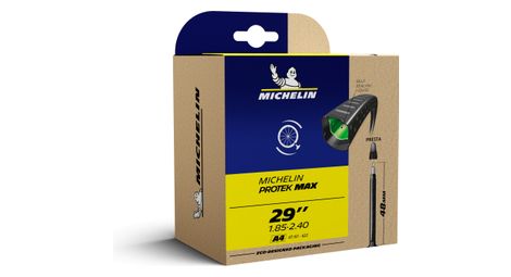La chambre a air michelin protek max assure le maintien de la pression grace a la combinaison du liquide preventif et du butyl details taille de roue 29 valve schrader 48 mm dimensions etrto poids reference ean 29 x 1 85 2 40 47 61 622 376 g m596491 3528705964917