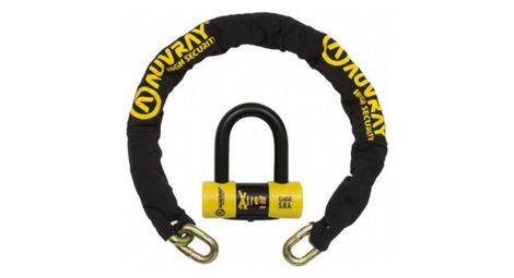 L antivol chaine auvray xtrem cadenas xtrem mini est certifie sra une norme reconnue par toutes les assurances en france garantissant un haut niveau de securite et de fiabilite gage de qualite cette certification assure une protection optimale contre le vol ce kit se compose d un bloque disque u xtrem mini et d une chaine gainee tous deux concus par auvray pour garantir une securite optimale fabriques en acier cemente ils beneficient d un traitement de durcissement qui leur confere une resistance accrue face aux tentatives de vol homologue classe sra cet ensemble repond aux normes exigees par les assurances et assure une protection fiable pour tous types de deux roues le bloque disque est dote d une anse de 16 mm de diametre et d un espace interieur de 62 x 52 mm il integre un cylindre de serrure anti percage ainsi qu un cache poussiere garantissant une securite renforcee contre les effractions il est fourni avec trois cles la chaine quant a elle dispose de maillons de 13 5 mm de diametre et d une longueur d un metre offrant une fixation robuste et fiable pour proteger efficacement votre vehicule details systeme de verrouillage a double mecanisme serrure a cle reversible pour une utilisation simplifiee protection contre le sciage et le crochetage cache anti humidite pour preserver la serrure dispositif empechant la rotation de l anse en cas de coupure service de reproduction de cle securise par code exclusif contenu du produit 1 chaine d 13 5 la chaine 1 20m est uniquement en lasso 1 cadenas xtrem mini sra avec anse de 16mm ref axtrauv mais sans cordon de rappel 3 cles