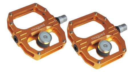 Les pedales magped sont une veritable innovation quelle que soit l utilisation cette version ultra2 permet une excellente stabilite avec une plateforme adaptee avec picots le mecanisme magnetique brevete permet de relacher le pied de la pedale rapidement et facilement par rapport aux pedales automatiques standards le risque d accident et de blessure sera reduit au minimum et votre esprit reste libre pour une experience de velo sans tracas les produit la pedale magped est une pedale plate moderne de haute qualite fabriquee a partir d aluminium de coupe cnc leger avec une broche titanium toutes les pedales magped sont extremement competitives par rapport aux autres pedales haut de gamme malgre le systeme d aimant ajoute la pedale magped assure un mouvement circulaire continue en utilisant vos muscles extenseurs 70 ainsi que vos muscles flechisseurs 30 pour des performances de conduite maximales vous sentirez la difference surtout lors de longs trajets la pedale tient compte de plusieurs degres de torsion de votre pied et reduit donc la tension sur vos chevilles lors de vos sorties de plus la position du pied peut etre modifiee vers l avant ou l arriere sans perte de force de traction pour une position ideale sur votre montee et votre descente la pedale est equipee de 3 roulements de type industriel etanches de haute qualite les axes peuvent etre echanges si necessaire l aimant au neodyme a haute performance est reglable a l aide d une unite d amortissement en polymere integree details utilisations enduro all mountain dh aimant neodyme 200n pour un cycliste 75 kg cache axe en noir orange vert et rose fabrication cnc a partir d un seul bloc de magnesium axe en titane dimensions longueur 109 mm largeur 85 mm hauteur 17 mm aimant neodyme haute performance poids par paire avec pins ultra2 200 338 g livre avec aimants plaques metalliques pour chaussures spd vis magnetiques en 2 longueurs cle allen plaque de positionnement recommandation de la marque 150n pour un cycliste jusqu a 80 kg 200n pour un cycliste 75 kg la marque recommande les chaussures spd avec une semelle fine a moyenne