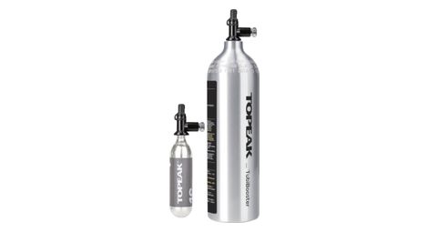 Design 2 en 1 ce produit unique fonctionne comme un mini compresseur d air qui permet a n importe quelle pompe de sol de comprimer de l air dans ce reservoir d air en aluminium de 1000cc qui libere rapidement un grand volume d air pour monter les talons de pneus tubeless la tete tubibooster en aluminium fonctionne egalement comme un gonfleur de co2 et est compatible avec les cartouches de co2 16g 25g filetees topeak details compatibilite de la tete de pompe pompes presta compatibilite avec les valves de pneus valves presta schrader pousser pour gonfler reservoir d air un litre permet de stocker jusqu a 200 psi 14 bar de pression d air varie selon la capacite de la pompe pression de travail 1800 psi 124 bar materiau aluminium fonctionnalite supplementaire compatible avec les cartouches de co2 topeak filetees de 16g 25g comprend une chambre a air d un litre taille 6 x 4 6 x 2 5 cm 2 4 x 1 8 x 1 gonfleur 28 5 x o8 1 cm 11 2 x o3 2 chambre a air poids 32 g 1 13 oz gonfleur 820 g 1 81 lb chambre a air