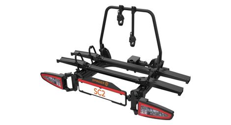 Porte velos pour 2 velos special pour voitures fourgons et camping cars a portes battantes avec fixation rapide et antivols description tout savoir sur l article porte velos 2 velos spinder sc2le sc2 est specialement concu pour les voitures ou les camping cars dotes de grandes portes arriere il y a plus d espace entre l arriere de la voiture et le spinder sc2 car le porte velos coulisse a bonne distance du hayon et ne bascule pas cela permet d ouvrir les grandes portes arriere meme avec les velos montes equipe technique et de sav francaise caracteristiques caracteristiques technique poids du porte velos 21 kg charge maximale 60 kg fixation rapide oui coulissant oui d environ 70 cm fixation des velos fixe cadres antivols amovible et a sangles strap ecartement des rails environ 24 cm empattement max 140 cm largeur max de pneu dans le rail jusqu a 3 25 pouces raccord d eclairage prise faisceau male13 broches pliable oui extension oui a 3 velos avec l option reference 11613 support de cadre specialement concu pour les cadres sensibles equipe d un eclairage led installation simple et rapide avec systeme de fixation rapide convient egalement aux velos a cadre oversize et en y convient a presque tous les types d attelage la peinture noir mat et les leds donnent un style moderneattention comme precise dans la notice lorsque les velos sont sur le porte velos ils ne doivent pas etre baches et les sieges enfants et les paniers doivent etre demontes afin de ne pas augmenter la resistance au vent accessoires accessoires en option rail d acces pour velos spinder ro1 ref 11612 extension 4eme velo ref 11613 documentation telecharger la notice d utilisation