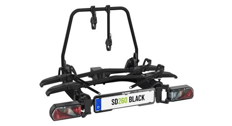 Le porte velos plateforme 2 velos sd260 las sur attelage pour le transport de velos sur boule d attelage convient pour les fourgons et les camping cars bus familiaux breaks a toit sureleve avec portes arrieres battantes et bien sur aussi pour les voitures particulieres compatible avec les velos electriques charge maxi par rail 30 kg convient egalement aux velos a cadre oversize et en y adapte a presque tous les types d attelage de remorque avec support de plaque d immatriculation reglable convient egalement pour l autriche dimension de rangement compacte extensible des glissieres avec une course d environ 70 cm permettent l ouverture de portes d une largeur allant jusqu a 85 cm environ fixe cadres antivols oui fixation rapide oui fixation des velos amovible et verrouillable fixe cadre strap avec cliquets type de rail rails en aluminium robustes avec supports de roues en plastique ecartement des rails environ 24 cm empattement du velo 130 cm maxi largeur maximale du pneu dans le rail jusqu a 3 25 pouces prise faisceau 13 broches avec courant permanent materiaux aluminium plastique acier poids a vide environ 20 5 kg charge utile maxi 60 kg autorisation de mise en circulation ue marque las