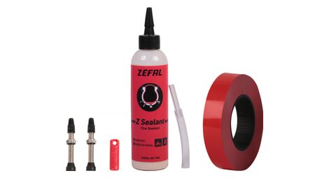 Kit de conversion tubeless zefal le z sealant a ete specialement developpe pour prevenir des crevaisons sa formule a base de latex repare les perforations jusqu a 3 mm pour vous permettre de rouler en toute tranquillite le produit est adapte pour tout type de pression basses ou hautes nos bandes tubeless bi matieres ont ete developpees pour garantir une resistance a la pression et une durabilite remarquables l ajout de l adhesif elastomere permet de prevenir les infiltrations du preventif dans la jante enfin grace a leur legere elasticite le montage des bandes est simplifie et peut se faire sans plis ni bulles valve tubeless avec obus demontable les produit compose de moins de 1 d ammoniaque le risque pas d endommager vos pneus facile a injecter compatible avec les pneus tubeless ou les chambres a air a valve schrader ou presta a obus demontable montage simplifie legere elasticite des bandes durabilite tres bonne tenue de pression risque d infiltration minimisee details largeur de fond de jante 30 mm largeur interne de jante 27 a 32 mm rouleau de 9 m valves tubeless en laiton hauteur des valves 45 mm preventif prevu pour 2 pneus vtt contenance 240 ml inclus 240 ml z sealant 9 m de fond de jante 30 mm paire de valves