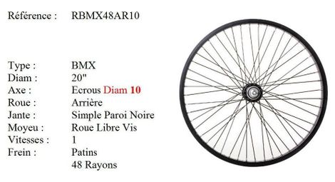 Roue 20 bmx arriere jante alu 48 rayons noir cnc frein patin moyeu alu axe de 10 ecrous roue libre 1v freestyle