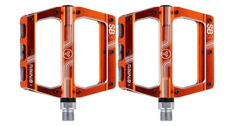 La paire de pedales sb3 flowy am 2 super light pour la pratique de la randonnee et du all mountain tres fine avec ses 18 mm elle offre un super grip et des sensations au plus proche du velo details materiaux plateforme aluminium axe crmo picots remplacables roulements bushings longueur plateforme 100 mm largeur plateforme 98 mm epaisseur 18 mm couloris orange poids 346 g la paire