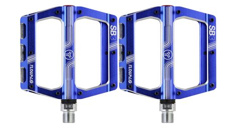 La paire de pedales sb3 flowy am 2 super light pour la pratique de la randonnee et du all mountain tres fine avec ses 18 mm elle offre un super grip et des sensations au plus proche du velo details materiaux plateforme aluminium axe crmo picots remplacables roulements bushings longueur plateforme 100 mm largeur plateforme 98 mm epaisseur 18 mm couleur bleu poids 346 g la paire