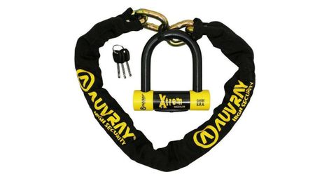 Chaine en acier cemente renforce 13 5 mmcorps en acier trempeanse reversible en acier trempe de 18 mmdouble mecanisme de verrouillageserrure a cle reversibleanti sciage anti crochetagecache de protection contre l humiditedispositif antigiratoire de la anse en cas de coupureservice de copie de cle par code exclusifantivol chaine avec unom du produit associe cadenasutilisation du produit antivols motorisesmodele du produit xtremcouleur noir jaunehauteur 100 mm ulongueur 1 00mdiametre 18 mm u 13 5 mm chainematiere acier trempe passivedivers attributs a clehomologation classe srapoids net 5 50 kglargeur 85 mm usous famille produit antivolsfamille produit equipements vehicule motorise conditionnement vendu a l unite version du produit uxtrem medium